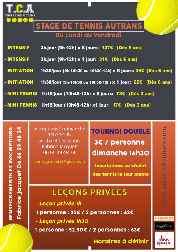 Comme chaque été des stages de tennis sont organisés au tennis club d’Autrans. A partir du 06/07 et jusqu’à fin août. Les licenciées au club ont une réduction de 10% sur les stages. Pour plus d’infos, n’hésitez pas me contacter. Bon été à tous 🎾 Cordialement, Fabrice Jacquet 0666294834